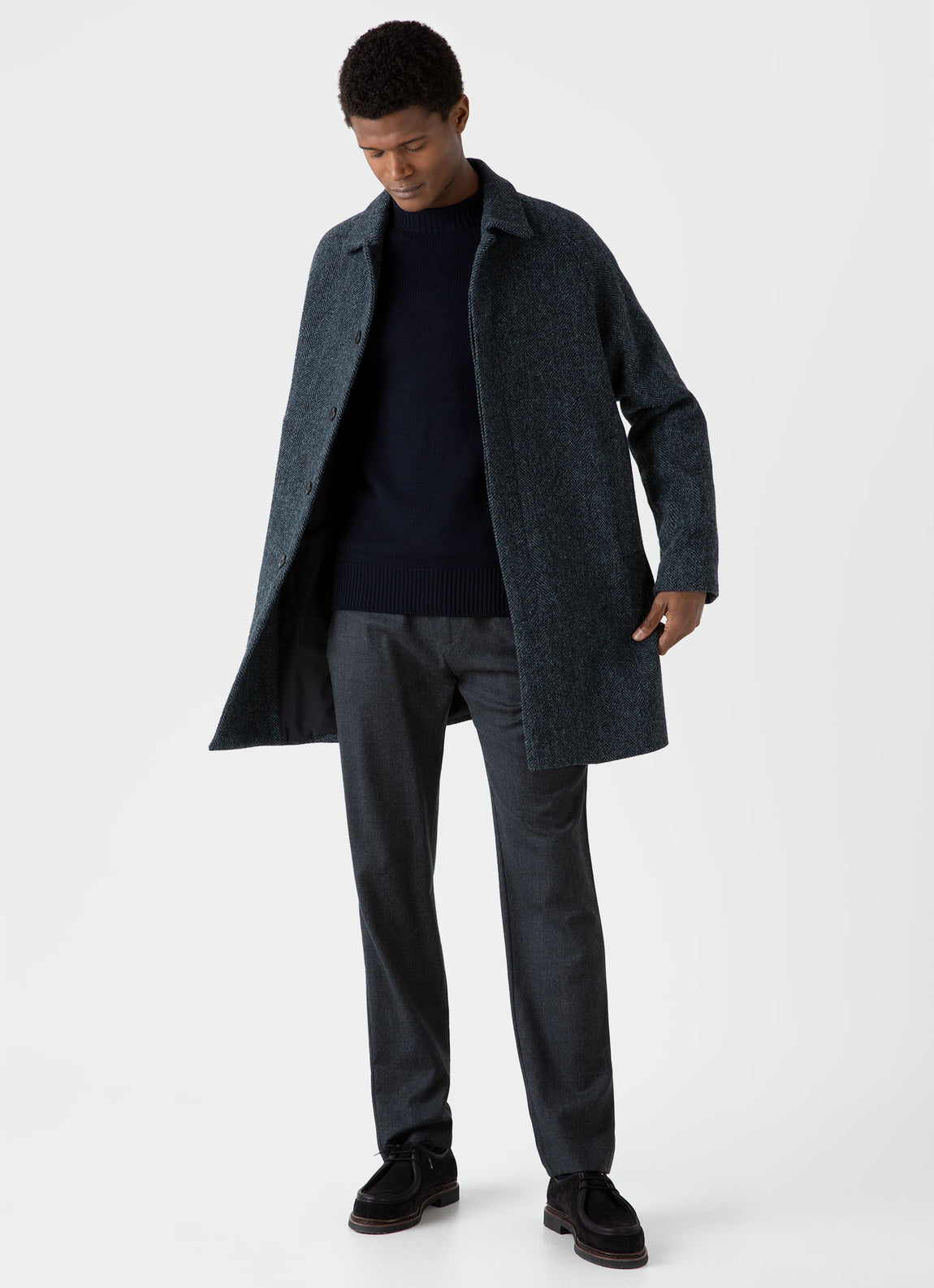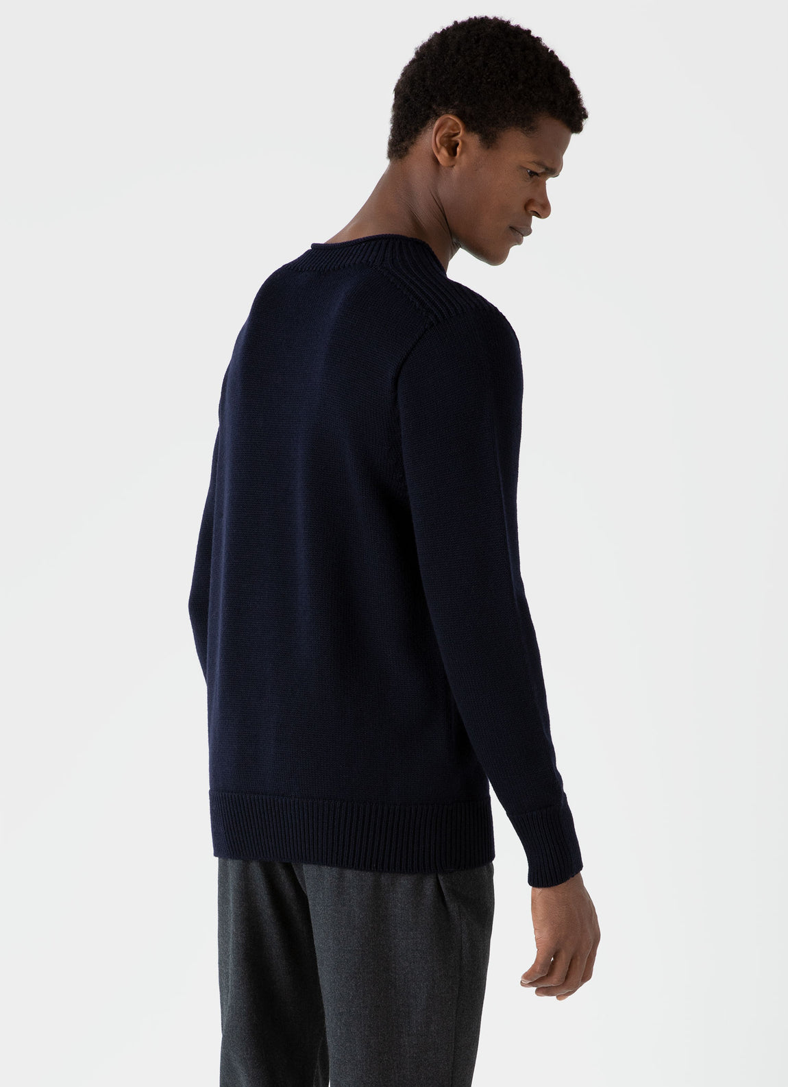 Made in England, this contemporary take on a classic guernsey jumper is made with extra-fine Italian merino wool. The chunky merino knit is complemented by modern details like the ribbed shoulder and rolled fisherman neckline. A British classic given a luxury twist.