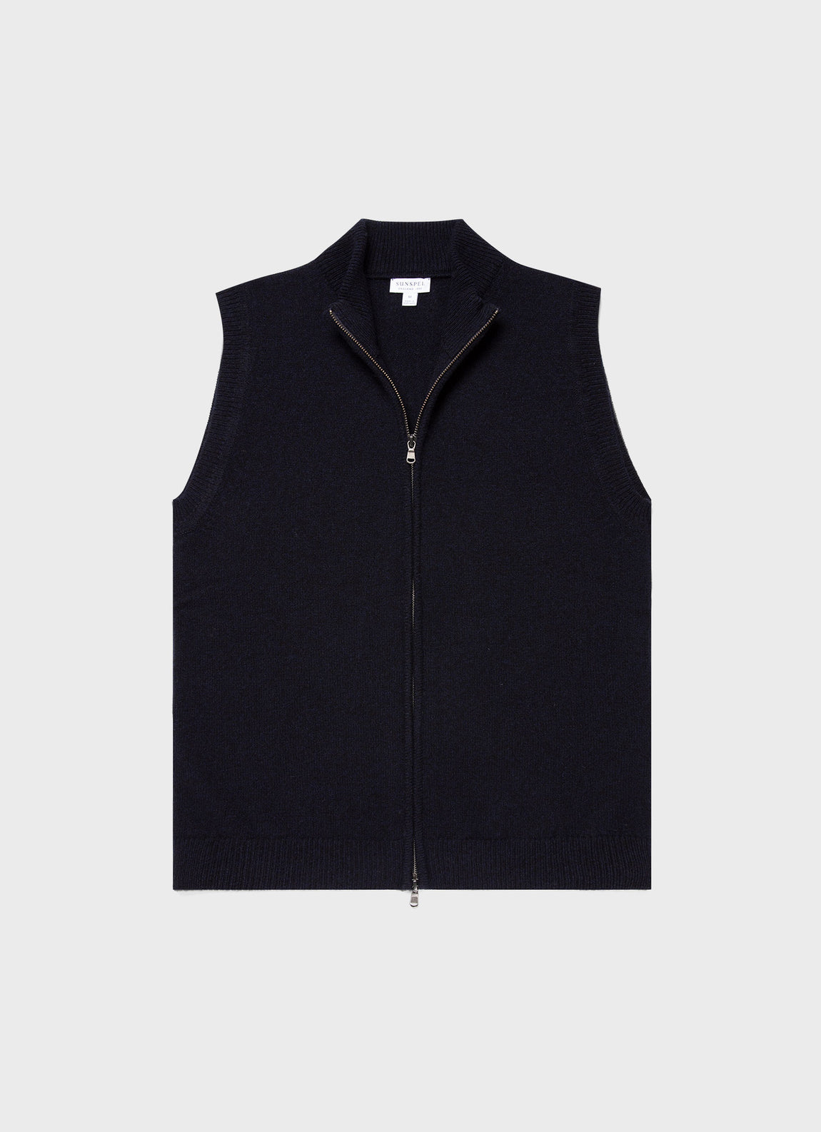 This is a perfect winter gilet. Crafted in Scotland from the finest Super Geelong lambswool. Once knitted the garment is washed in natural Scottish spring water for an exceptionally soft handle. It has a full double ended zip and a regular fit. Layer under a coat or over a lightweight rollneck.