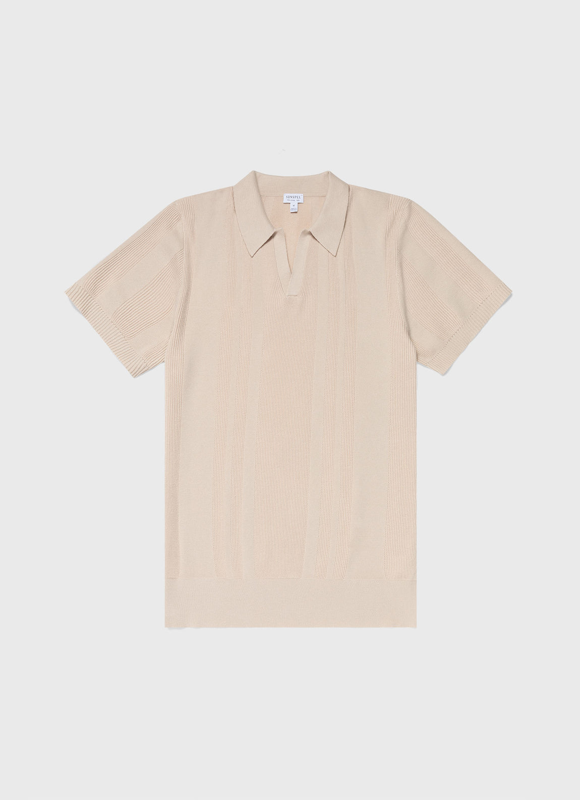An elegant summer knitted polo, with textured stripe detailing inspired by knitted polos from the 50s. Made with Egyptian long-staple cotton for a smooth, soft feel. Regular fit with a buttonless neck and rib hems. Style with our linen pleat or drawstring shorts or dress up with a linen jacket.