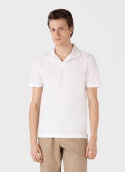 A smart, elegant polo crafted from refined Italian textured jersey, inspired by mesh fabrics in our archive. Lightweight and soft, it has a regular fit, side slits, and an open, buttonless collar. A perfect piece for holiday evenings, dressed up or down.