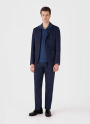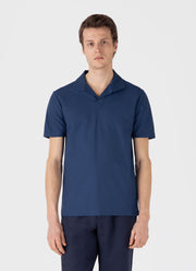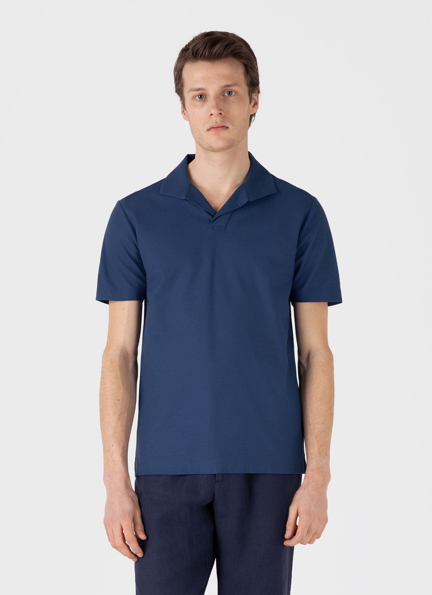 A smart, elegant polo crafted from refined Italian textured jersey, inspired by mesh fabrics in our archive. Lightweight and soft, it has a regular fit, side slits, and an open, buttonless collar. A perfect piece for holiday evenings, dressed up or down.